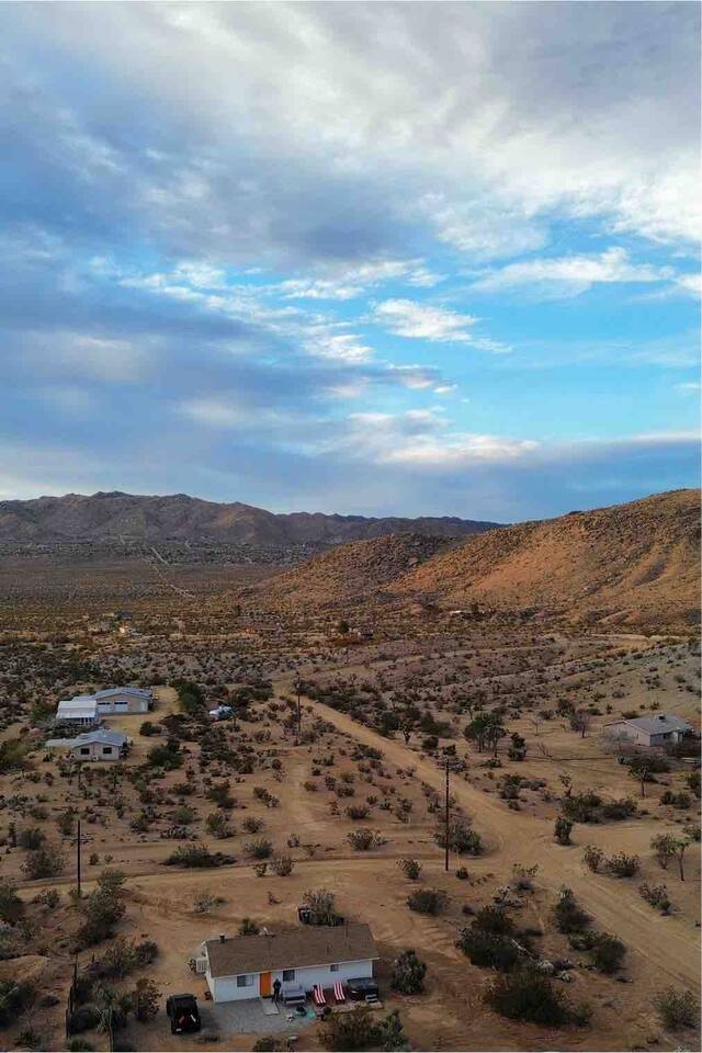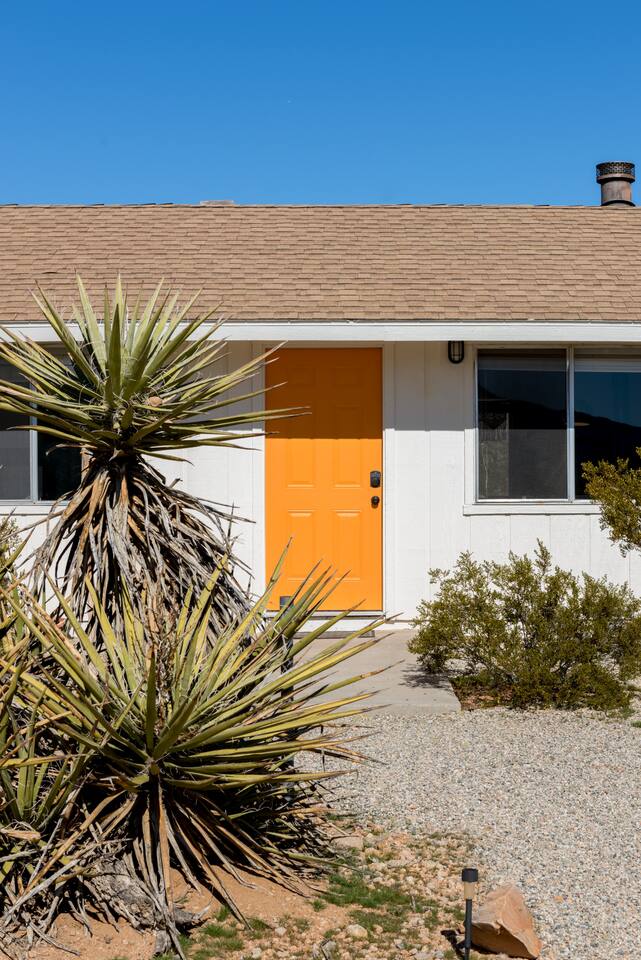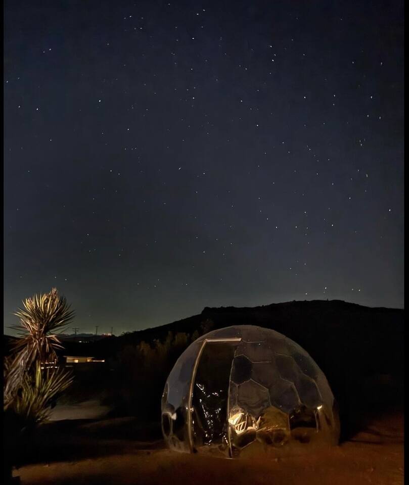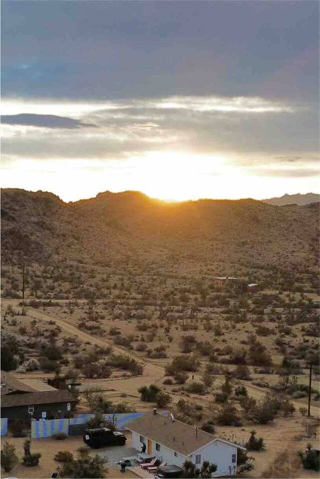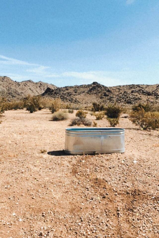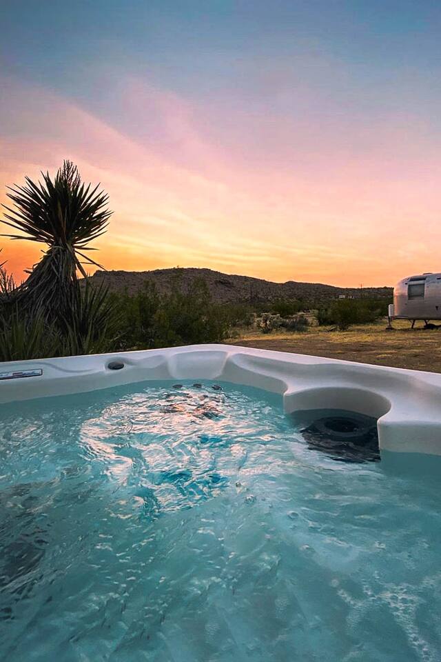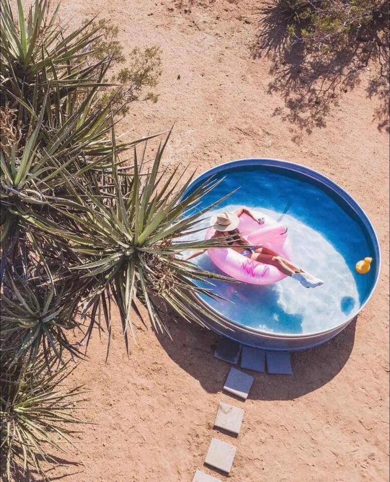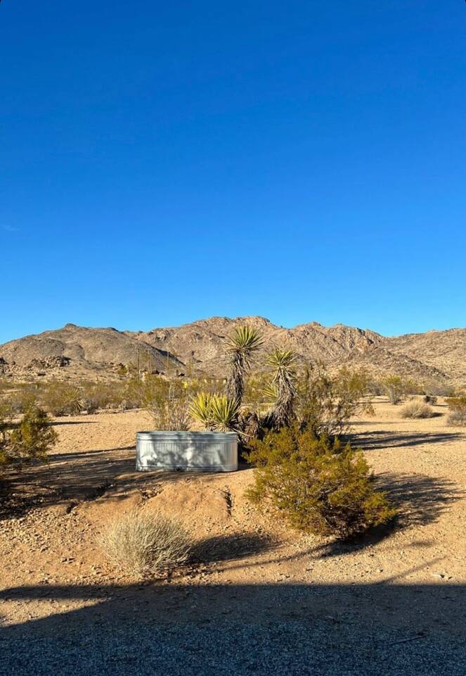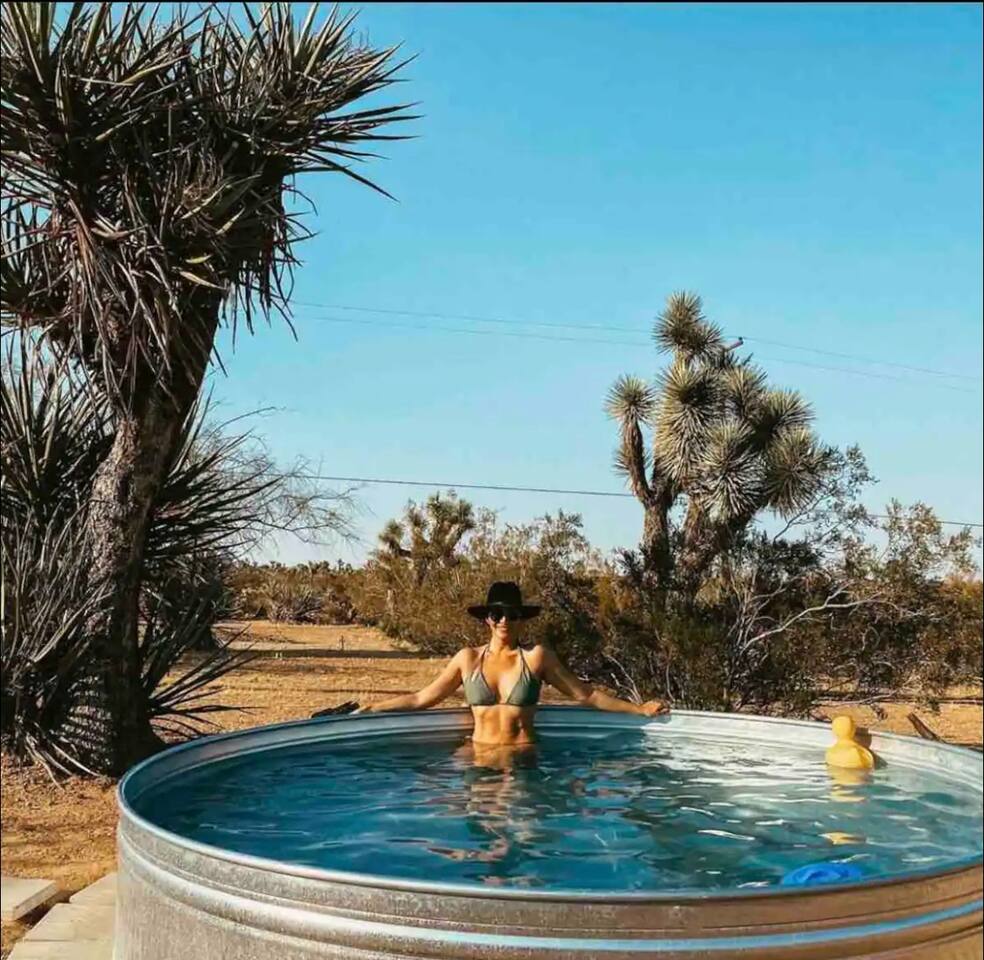 Gaze at a captivating watercolor sunset from the hot tub as the twilight sky brightens with stars. Decorated with comfort in mind, this cozy desert style boho modern-rustic home treats guests to a 10ft cowboy pool, a fun outdoor cold plunge bathtub, hot tub with a deck lounge chairs, fire pit, BBQ grill, stargazing mirror dome and telescope, 2 electric bikes and spectacular unobstructed desert views for acres. Near Joshua Tree National Park, Pappy and Harriet’s & other attractions. @casacabin