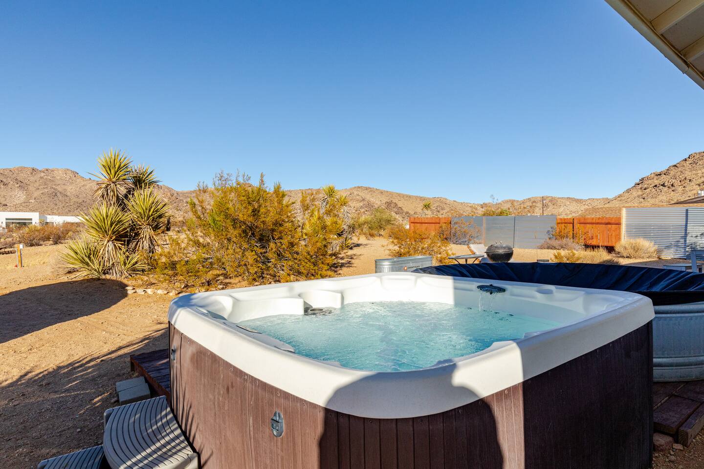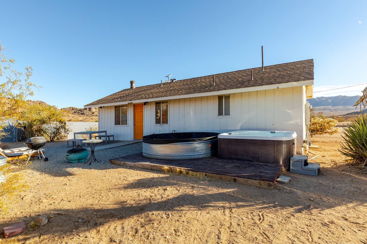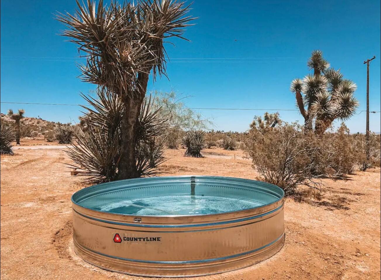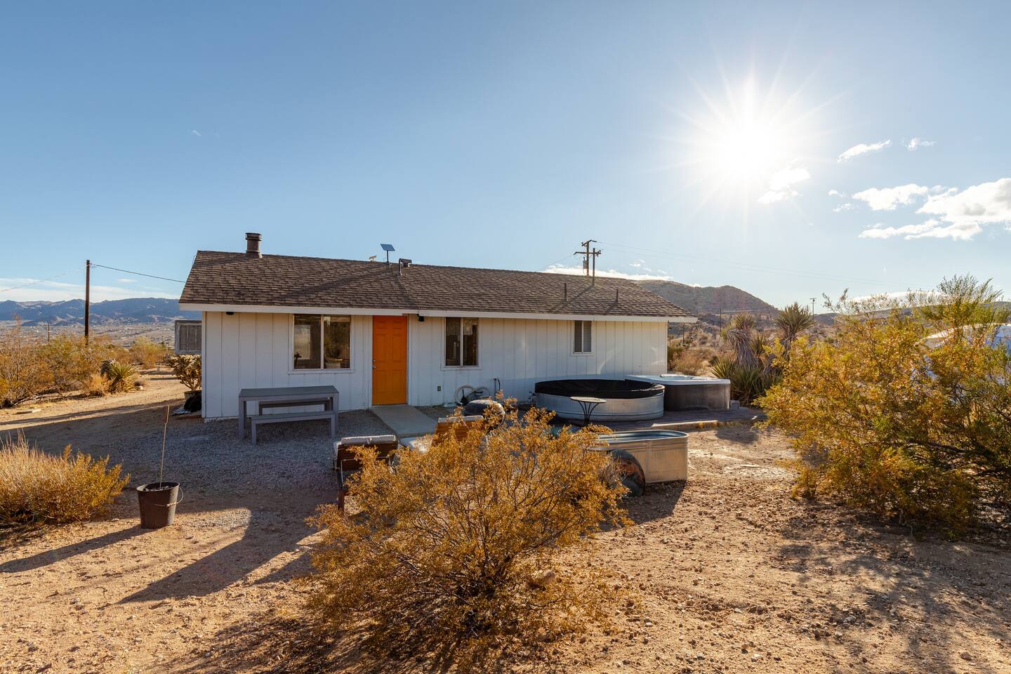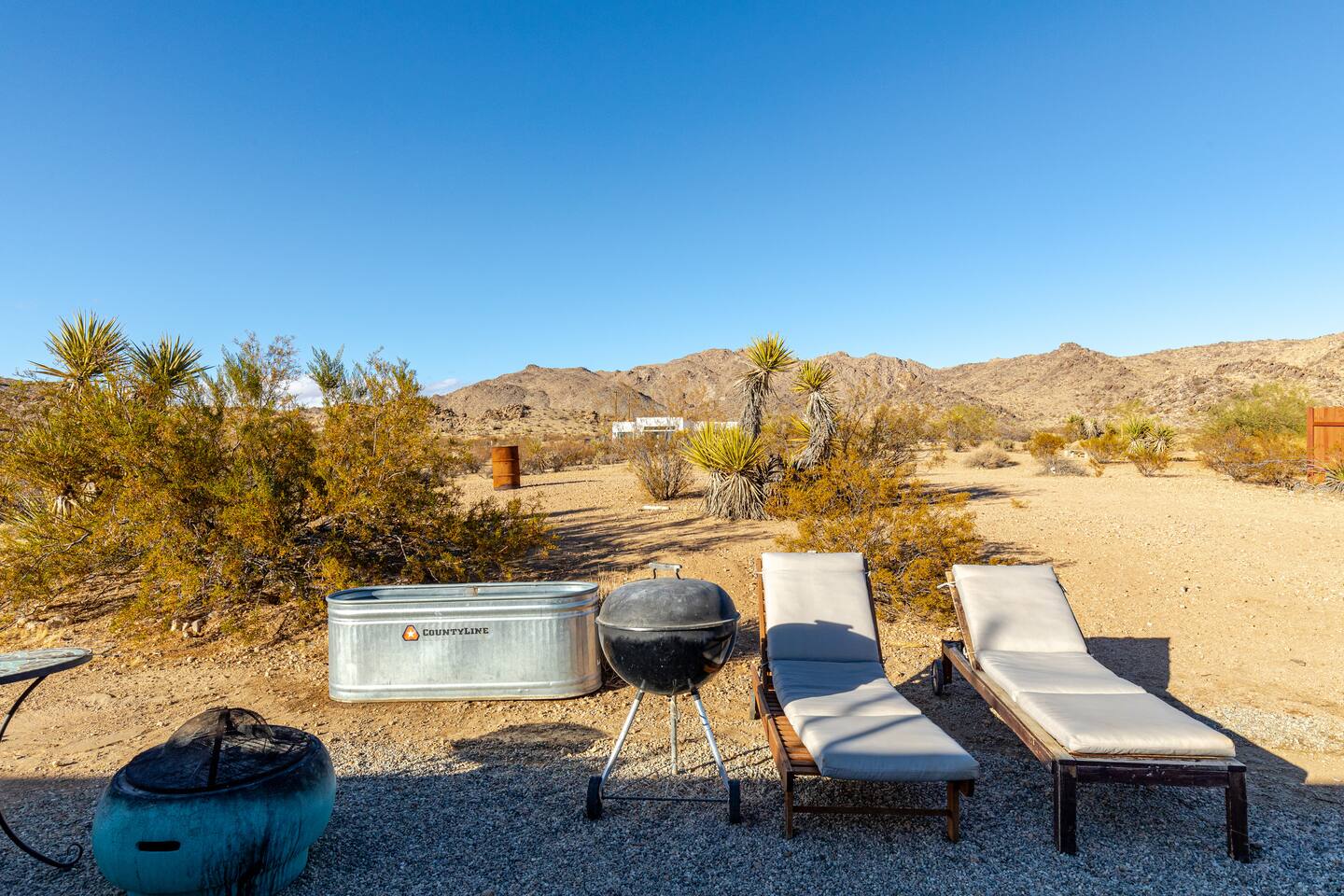 Gaze at a captivating watercolor sunset from the hot tub as the twilight sky brightens with stars. Decorated with comfort in mind, this cozy desert style boho modern-rustic home treats guests to a 10ft cowboy pool, a fun outdoor cold plunge bathtub, hot tub with a deck lounge chairs, fire pit, BBQ grill, stargazing mirror dome and telescope, 2 electric bikes and spectacular unobstructed desert views for acres. Near Joshua Tree National Park, Pappy and Harriet’s & other attractions. @casacabin