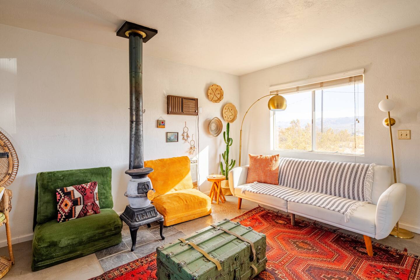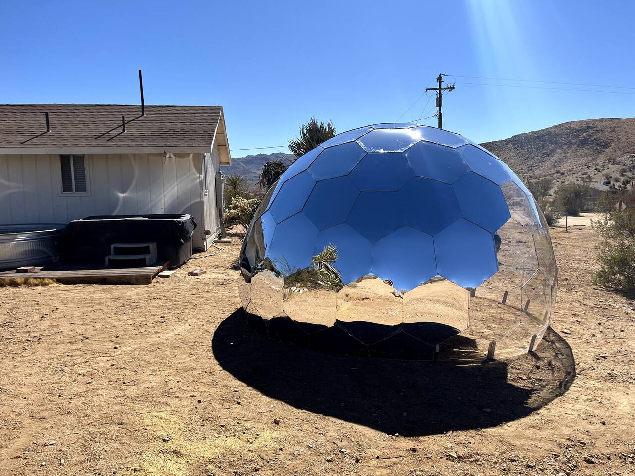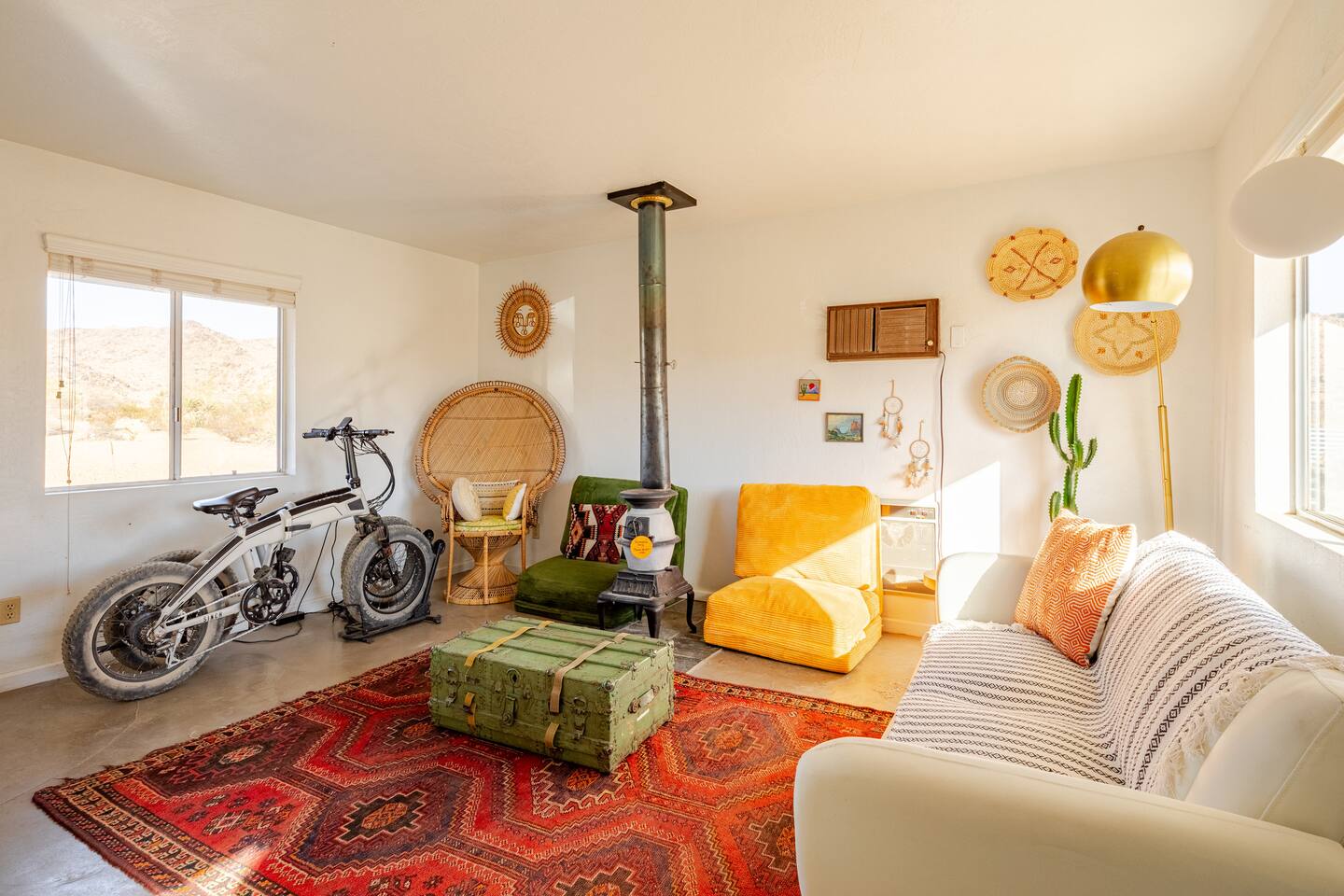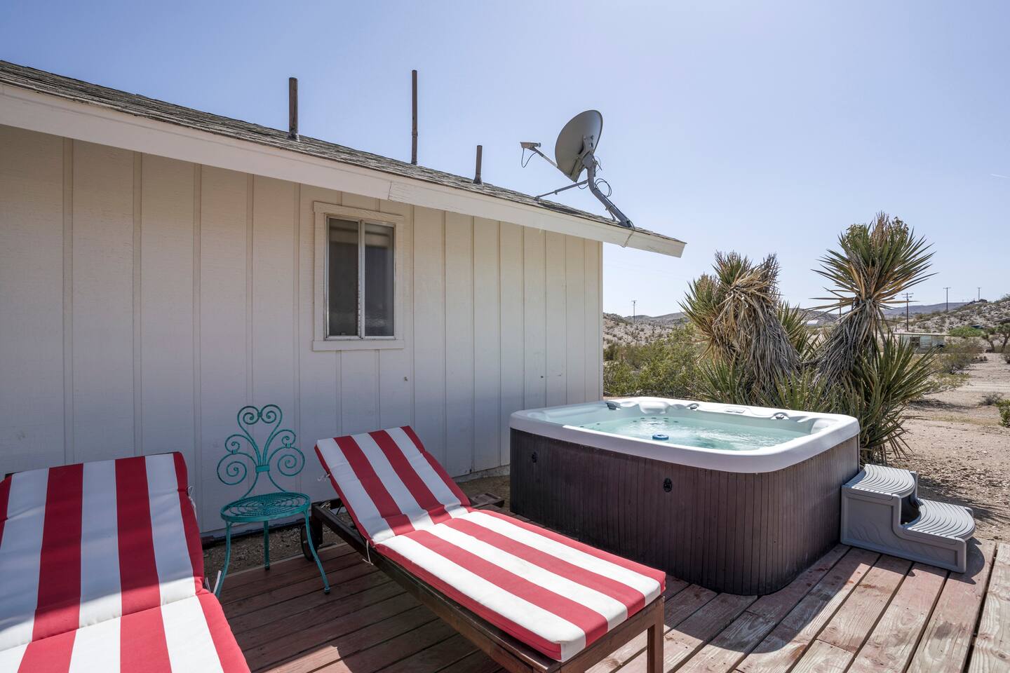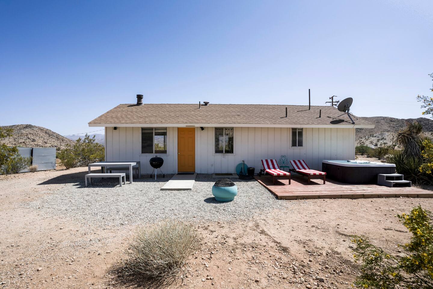 Gaze at a captivating watercolor sunset from the hot tub as the twilight sky brightens with stars. Decorated with comfort in mind, this cozy desert style boho modern-rustic home treats guests to a 10ft cowboy pool, a fun outdoor cold plunge bathtub, hot tub with a deck lounge chairs, fire pit, BBQ grill, stargazing mirror dome and telescope, 2 electric bikes and spectacular unobstructed desert views for acres. Near Joshua Tree National Park, Pappy and Harriet’s & other attractions. @casacabin
