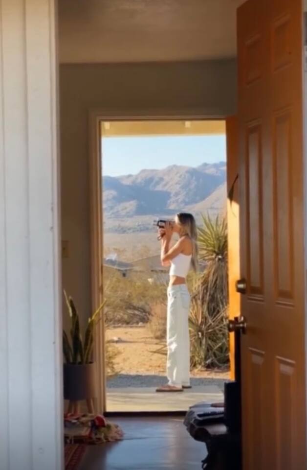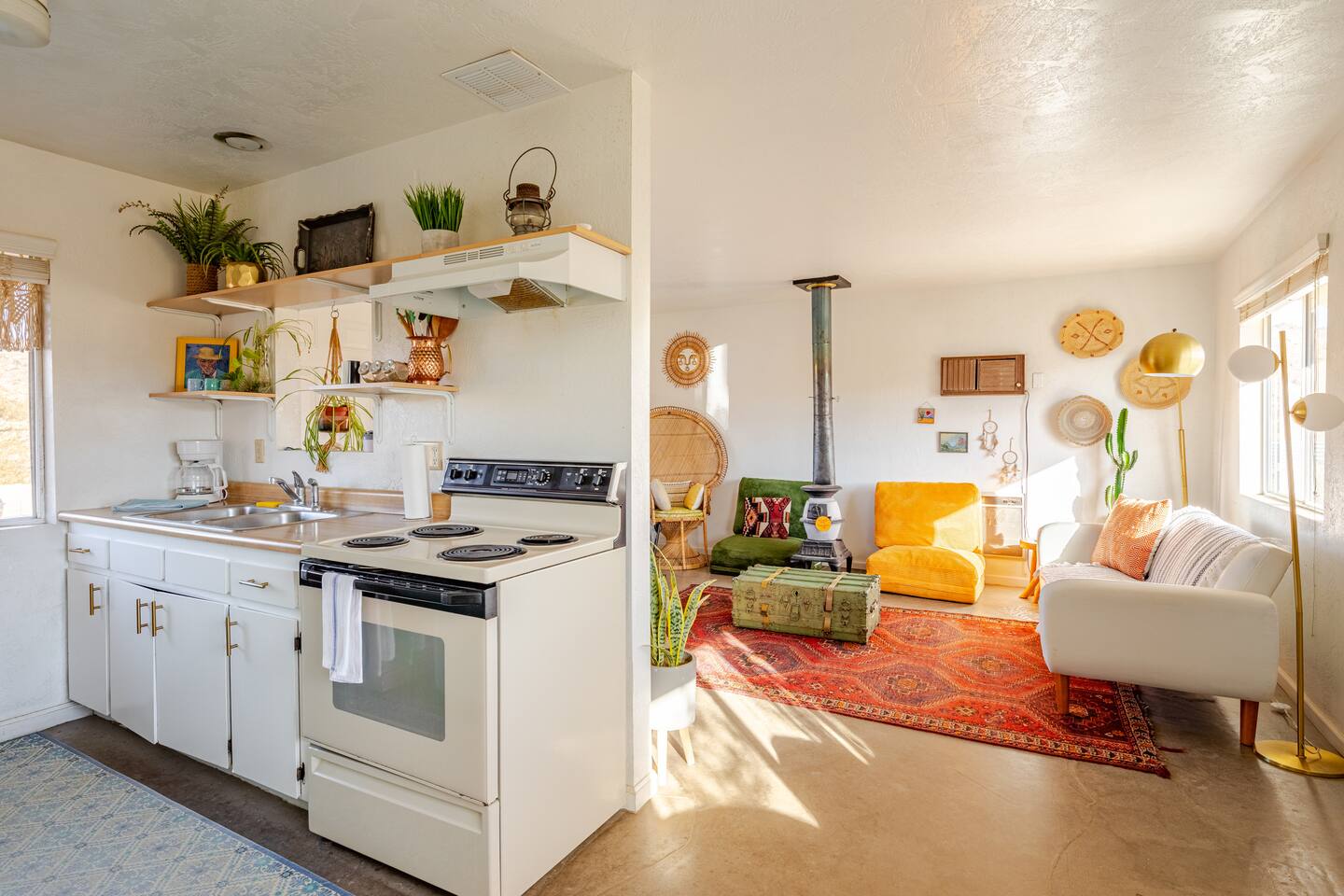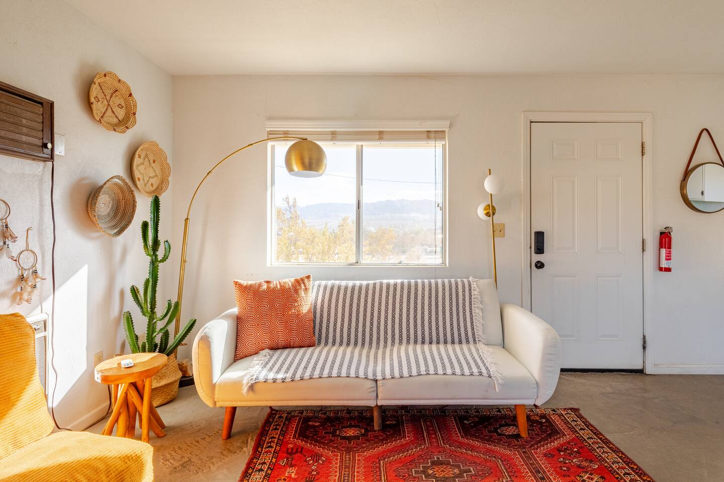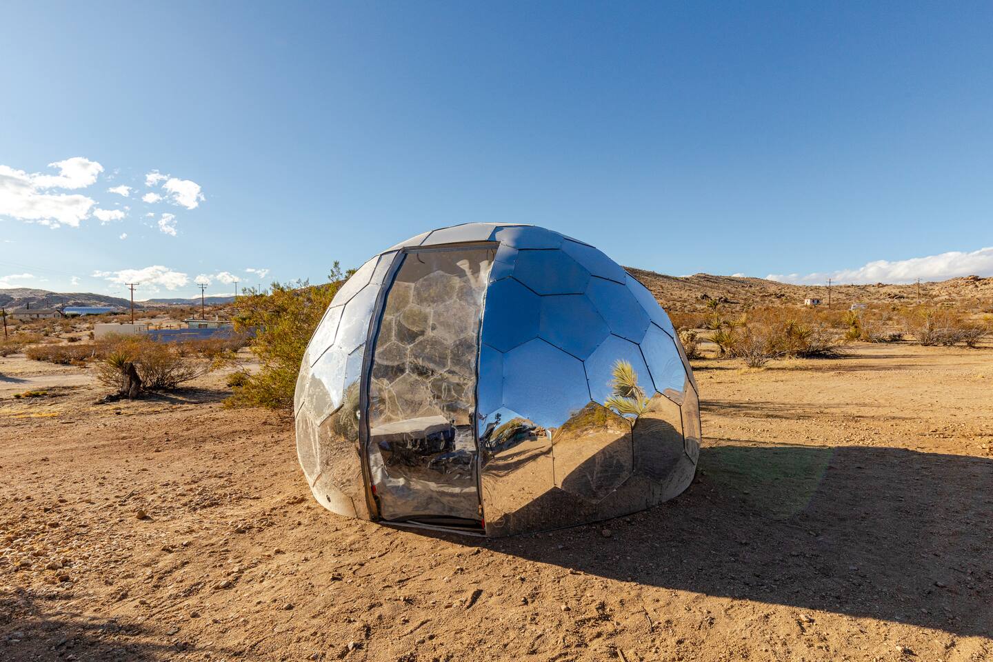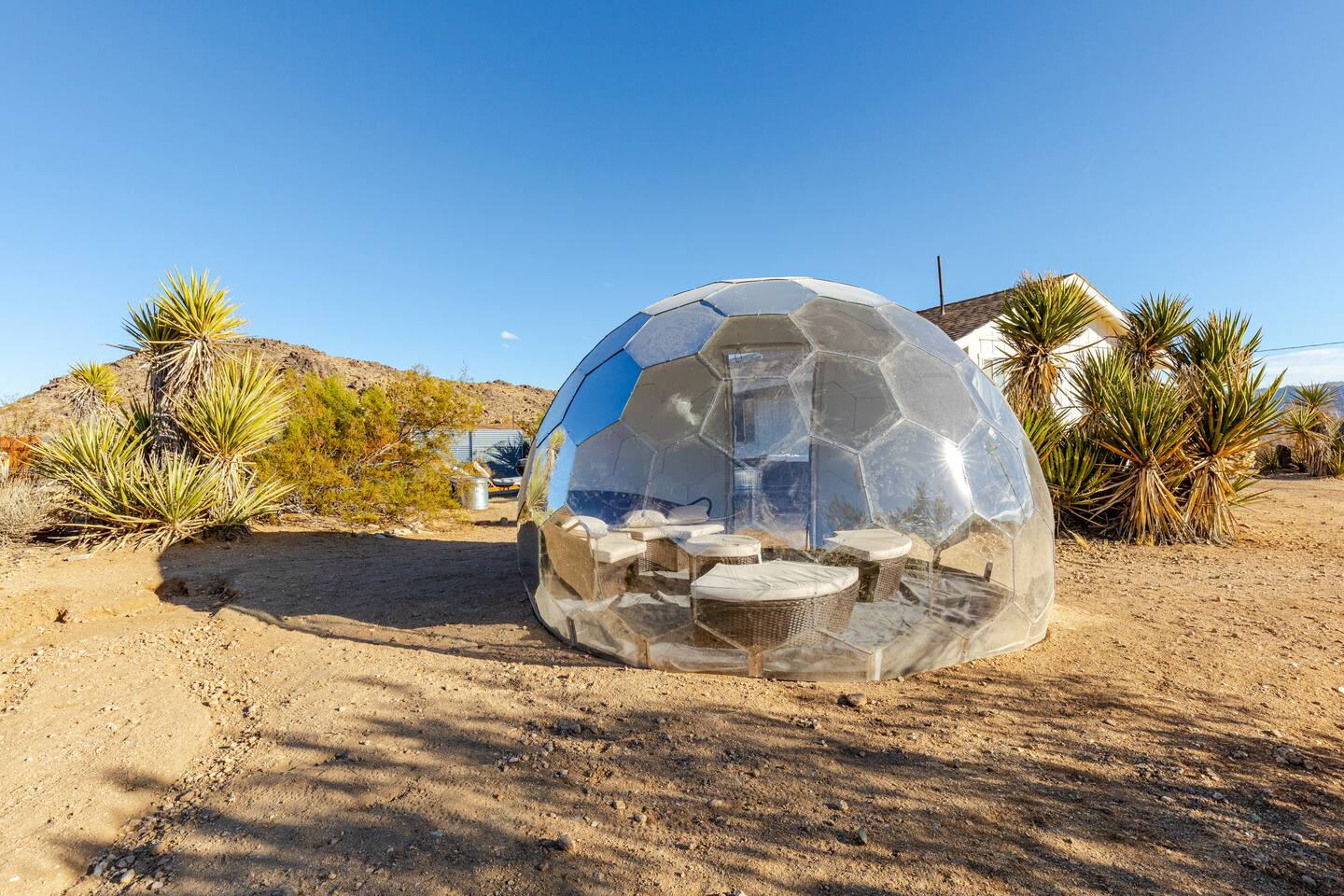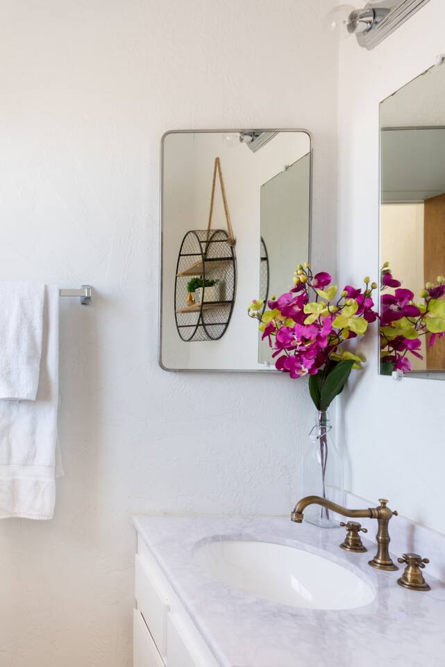 Gaze at a captivating watercolor sunset from the hot tub as the twilight sky brightens with stars. Decorated with comfort in mind, this cozy desert style boho modern-rustic home treats guests to a 10ft cowboy pool, a fun outdoor cold plunge bathtub, hot tub with a deck lounge chairs, fire pit, BBQ grill, stargazing mirror dome and telescope, 2 electric bikes and spectacular unobstructed desert views for acres. Near Joshua Tree National Park, Pappy and Harriet’s & other attractions. @casacabin