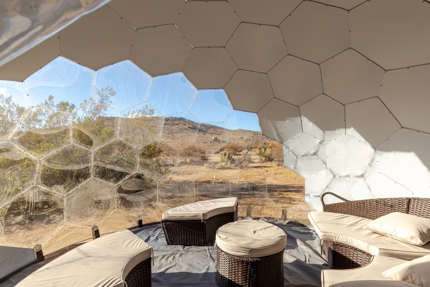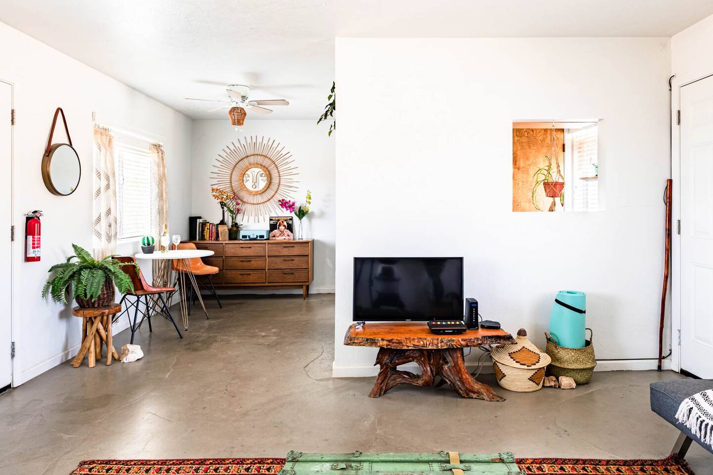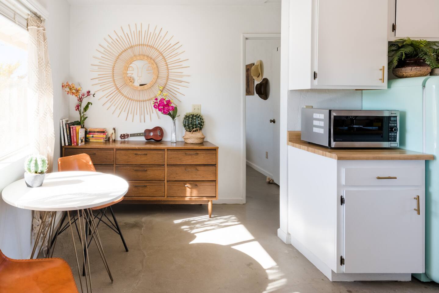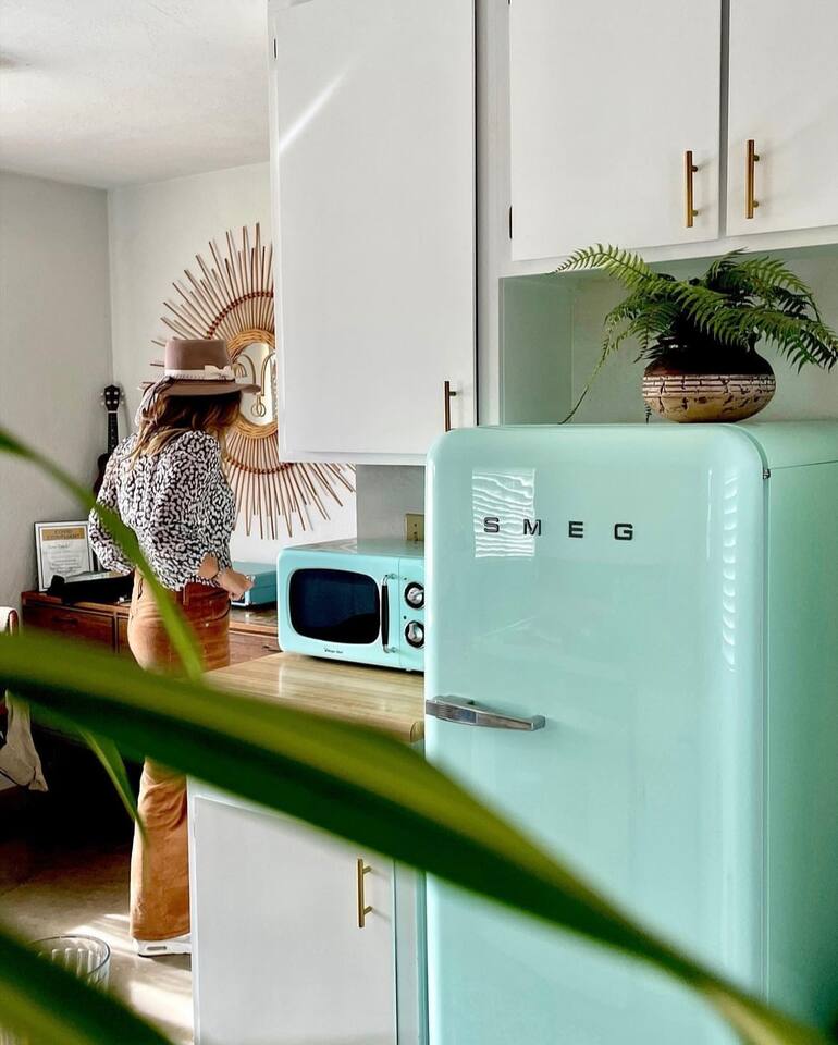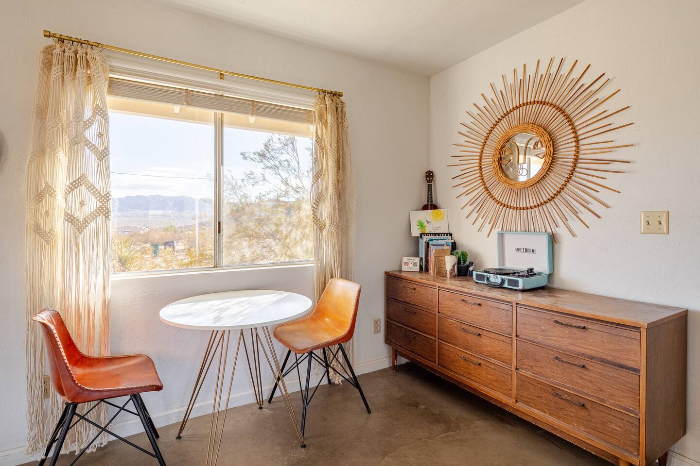 Gaze at a captivating watercolor sunset from the hot tub as the twilight sky brightens with stars. Decorated with comfort in mind, this cozy desert style boho modern-rustic home treats guests to a 10ft cowboy pool, a fun outdoor cold plunge bathtub, hot tub with a deck lounge chairs, fire pit, BBQ grill, stargazing mirror dome and telescope, 2 electric bikes and spectacular unobstructed desert views for acres. Near Joshua Tree National Park, Pappy and Harriet’s & other attractions. @casacabin
