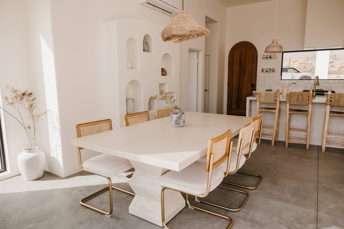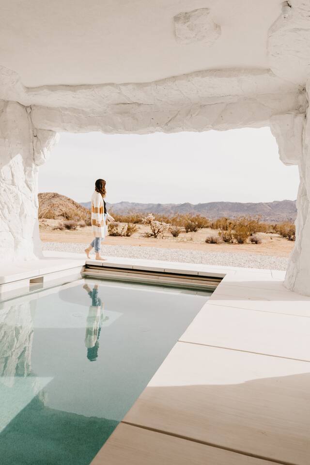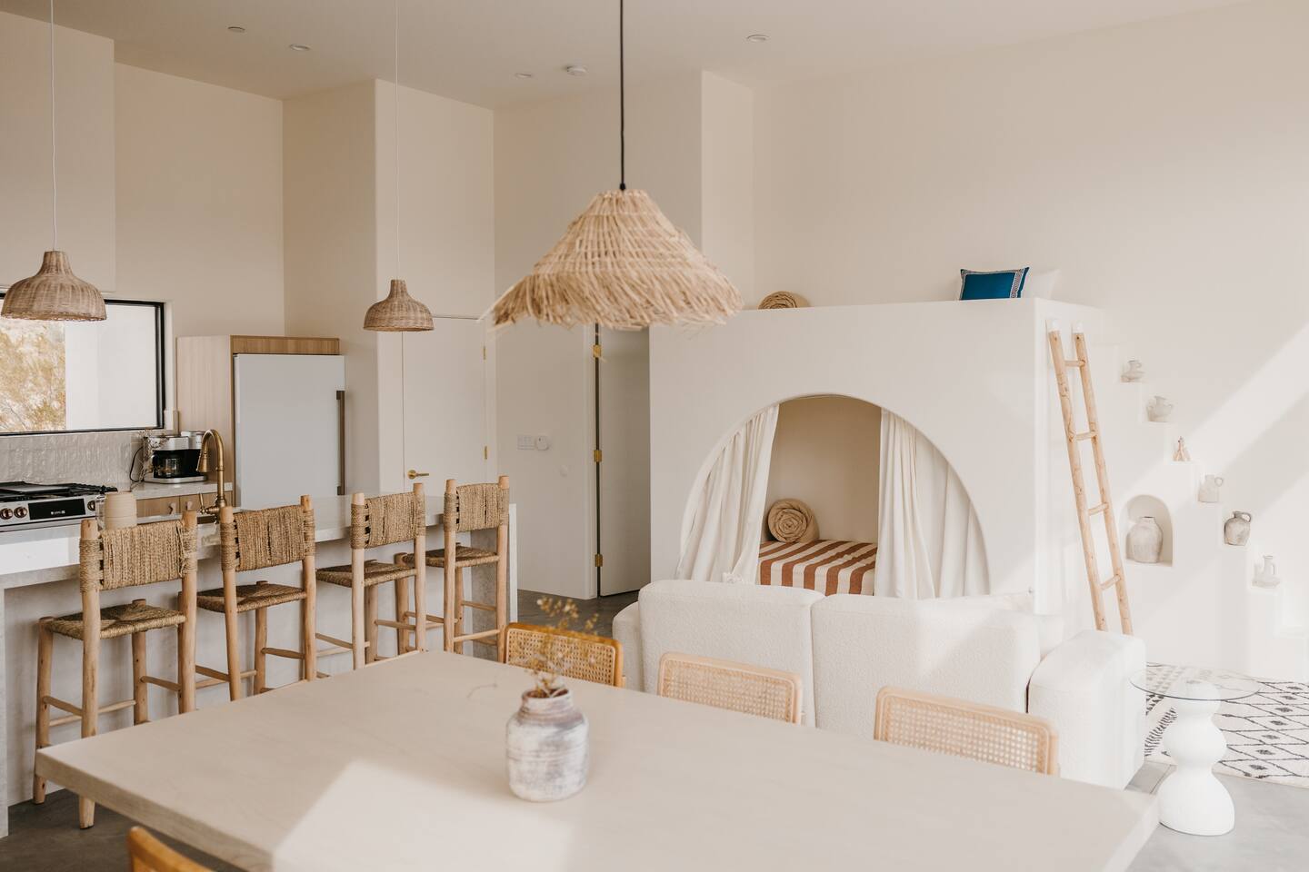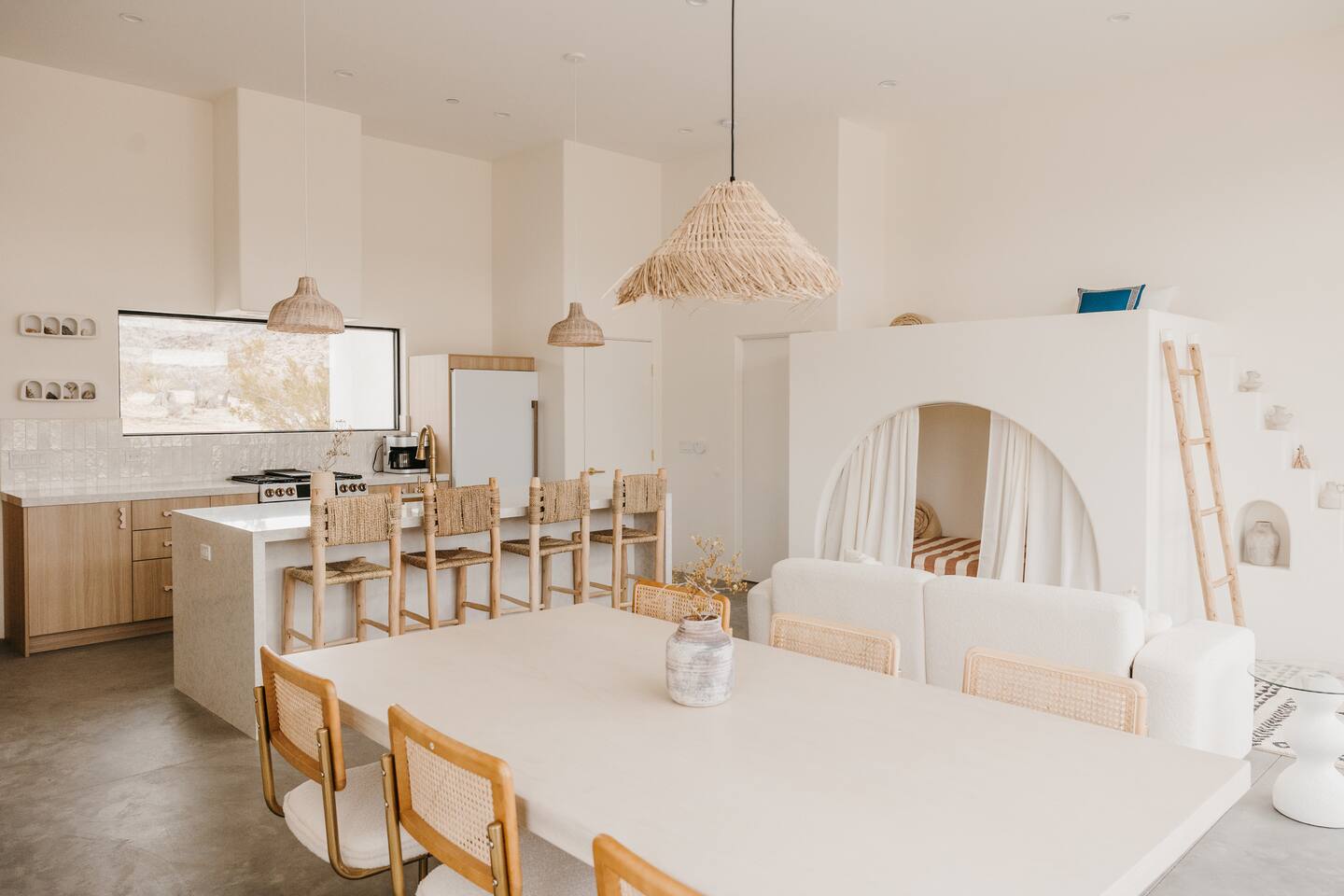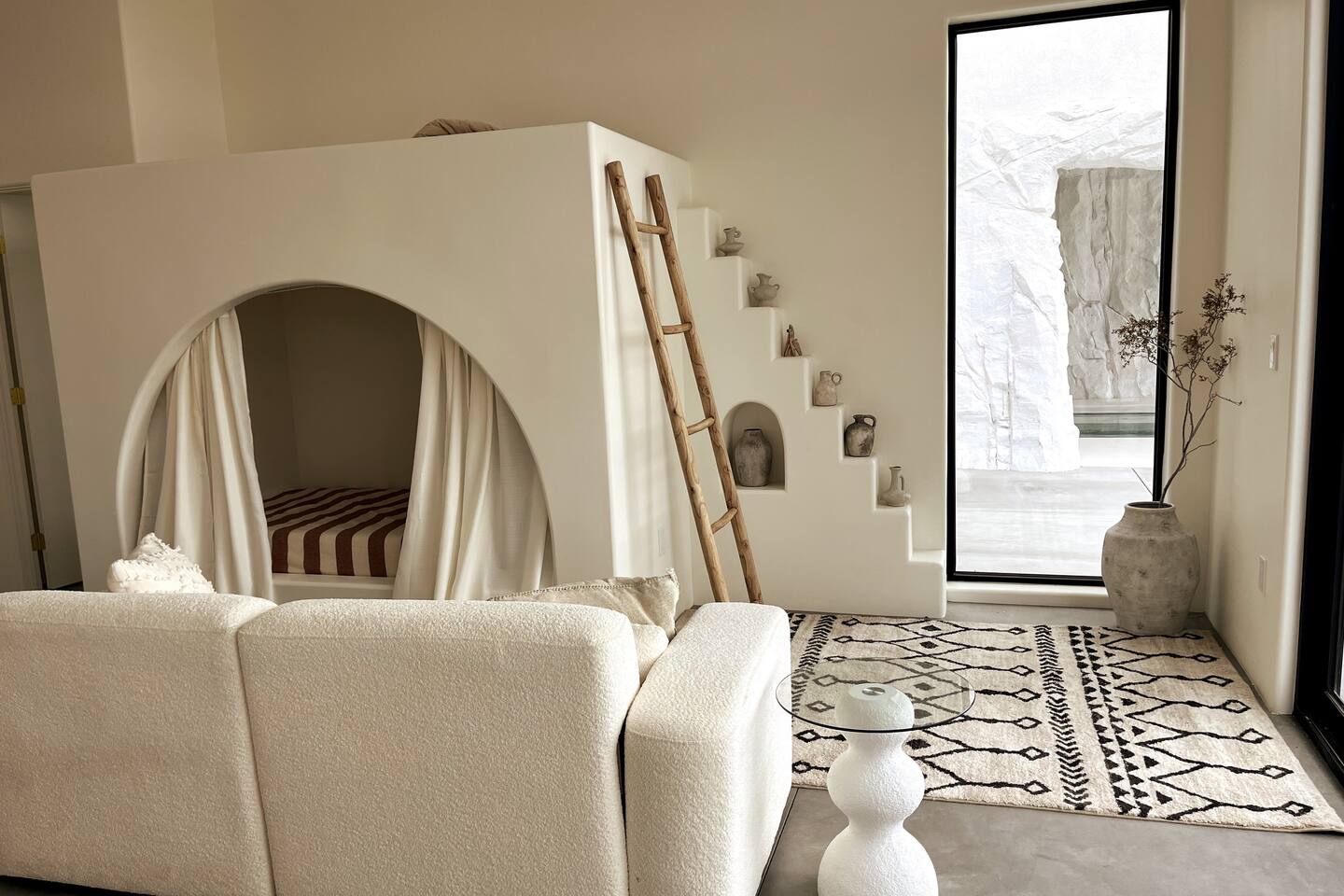 Introducing our breathtaking new Airbnb retreat nestled in the heart of Joshua Tree, a true fusion of Cycladic charm and desert serenity. Inspired by the iconic architecture of the Greek Cycladic islands, this unique desert oasis promises an unforgettable escape. As you step onto the property, you'll be transported to a world of whitewashed simplicity and organic elegance, reminiscent of the quaint villages of Greece. The pristine exterior, adorned with rounded edges and minimalist lines, seamlessly blends into the rugged Joshua Tree landscape. The centerpiece of this remarkable retreat is a private saltwater cave pool and spa, carefully carved into the rocky terrain. Dive into the crystal-clear waters or unwind in the soothing warmth of the spa, all while surrounded by the natural beauty of the desert. Lush vegetation and indigenous flora create a secluded haven, offering both tranquility and privacy. Inside, you'll find a meticulously designed interior that marries Cycladic aesthetics with modern comfort. Sun-soaked rooms are adorned with soothing whites and earthy ocean tones, providing a harmonious contrast to the desert's vibrant hues. The open-plan living space with an arch bunk bed seamlessly connects to a fully-equipped kitchen, inviting guests to create culinary masterpieces. Enjoy panoramic views of Joshua Tree's iconic rock formations while savoring Mediterranean-inspired cuisine or simply gazing at the starry night sky. Whether you're seeking a peaceful retreat, a romantic getaway, or a luxurious escape, our Joshua Tree Airbnb inspired by Cycladic architecture guarantees a unique and rejuvenating experience. Unplug, relax, and let the harmonious blend of Greece and the desert enchant your senses, making your stay an unforgettable memory. Follow us @casacabin