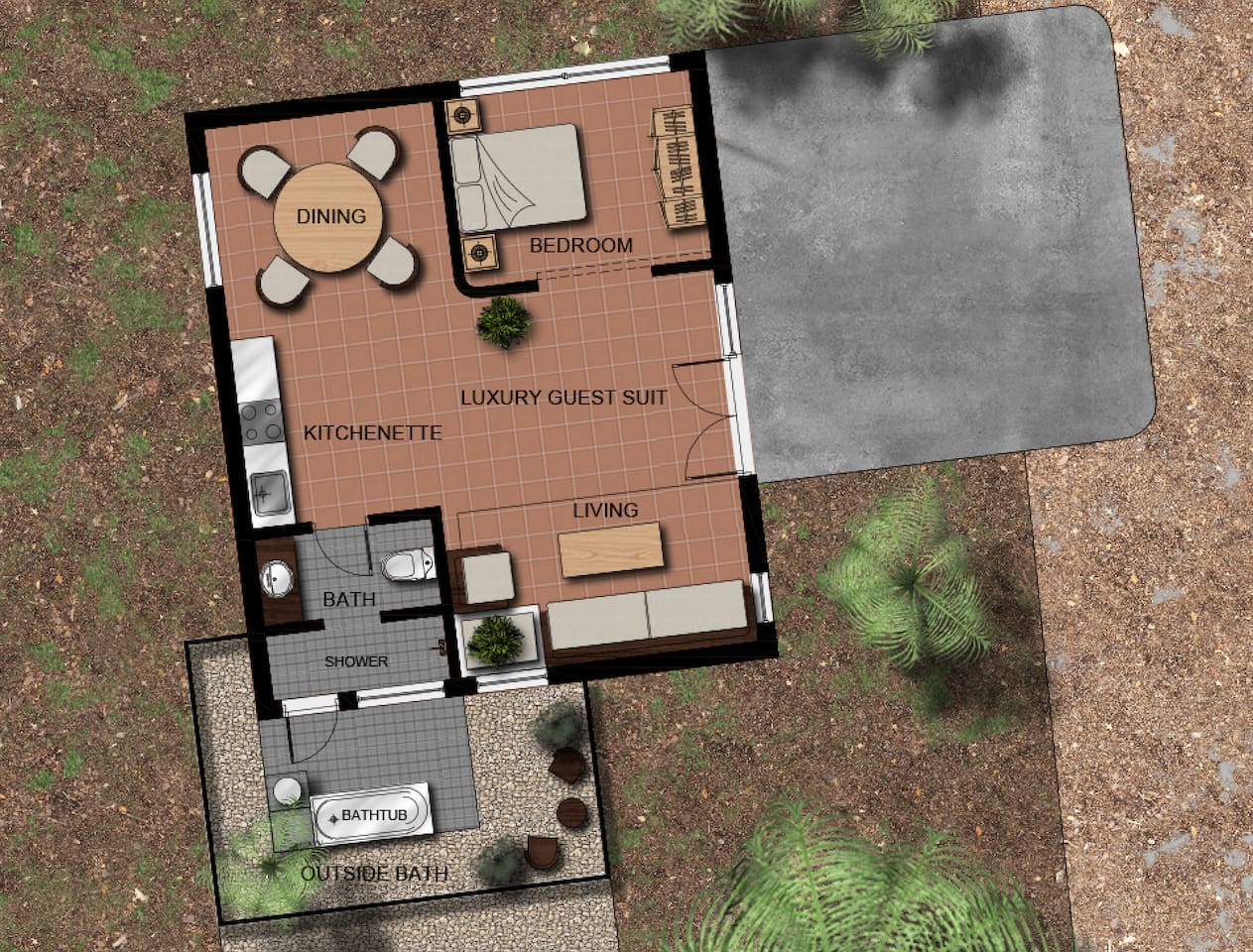 Featuring a king bed, sprawling living space, modern kitchenette, a luxurious rain shower and a dreamy outdoor copper Japanese soaking tub with jets.